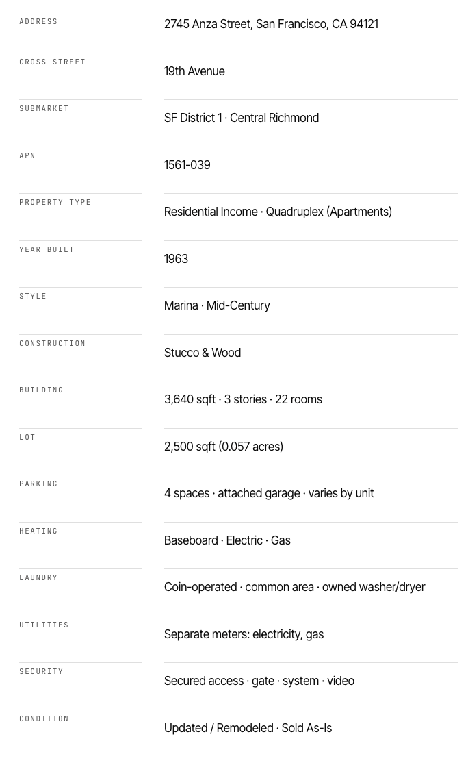 First time on the market since 1990. A turn-key, 100% occupied four-unit asset on a quiet Inner Richmond block — currently undergoing a 2026 Warm Modern exterior transformation, with rents recently reset to legal allowable and significant unrealized upside on turnover.